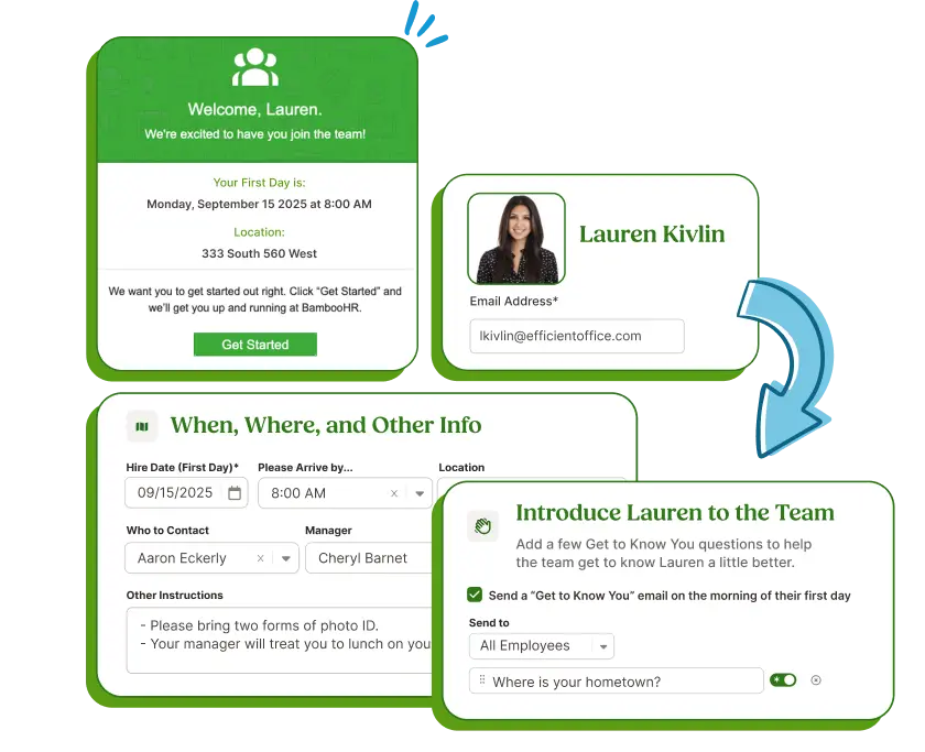 Create personalized welcome experiences to introduce new hires to company culture, policies, and team members.