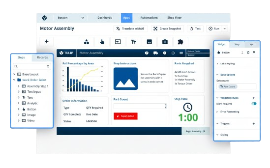 Tulip provides visual dashboards that show production metrics, downtime trends, cycle times.