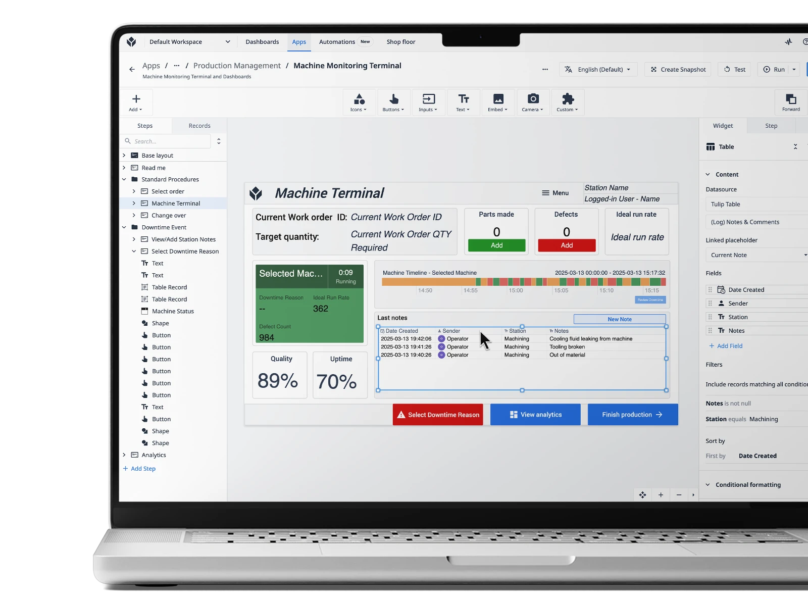 Tulip includes a no code app builder that lets manufacturing teams design their own apps.